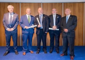 José Luis López Latorre, Javier Calvo Romaguera y Jesús Pardo Torrijo, recibieron sus distinciones de la mano del presidente de la Unión de Asociaciones de Ingenieros Técnicos Industriales y Graduados en Ingeniería de la rama industrial de España, Juan Ignacio Larraz Plo
